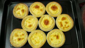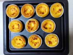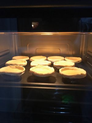 倒入蛋挞皮(八成即可),加入几颗葡萄干或者蔓越莓干。烤箱预热十分钟,上下火220°C25分钟