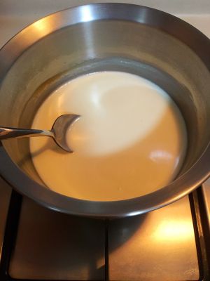 锅中依次加入淡奶油、牛奶小火加热,放入细砂糖拌匀至砂糖融化。