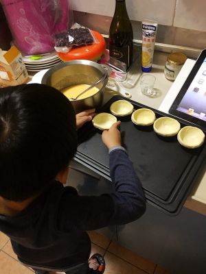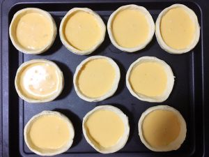 把蛋挞液盛进蛋挞皮里面,大约七分满。
