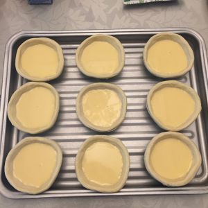 往挞皮倒入蛋挞液,预热后 放烤箱