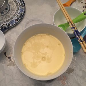 牛奶加糖稍微一下 融化白糖,鸡蛋散搅拌后加入面粉,继续搅拌,一起倒入牛奶中