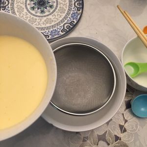 牛奶里倒进白糖加热融化后,待冷却再把蛋黄,淡奶油加入,在倒低筋面粉用筛过一下…全搅均匀,再倒进另一个盆里,同样用筛过滤