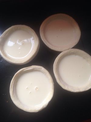 过滤好的蛋挞液倒入蛋挞皮中,七、八分满即可。