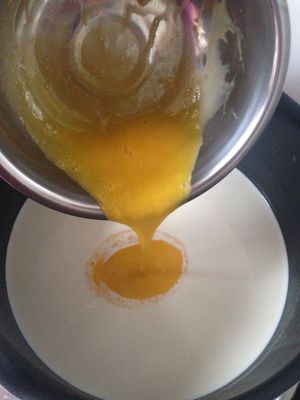 隔热水搅拌至糖融化,待凉后加入拌均匀的蛋黄浆,再搅拌均匀,蛋挞水就完成了