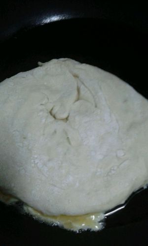 来过热平底锅,加入少量油,等油热开。用大汤勺(平时舀汤的那种)勺一勺多一点的面糊,然后转动平底锅让整个平底锅都要有面糊(用中小火慢煎)时不时的看看底部是否有变色,之后翻面再中小火煎另一面