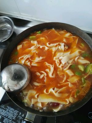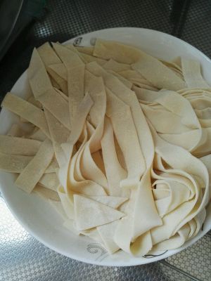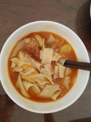 先把面片捞出放入盘中 再把鸡肉放入盘中 这道大盘鸡拌面就算完成了 三人量 全吃光光了