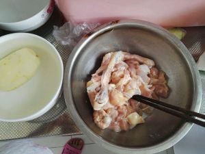 第一步,将琵琶腿切成块,放入食盐和淀粉腌5-10分钟。期间准备其他食材,土豆、番茄去皮切成大块,葱切段,蒜、姜切片。