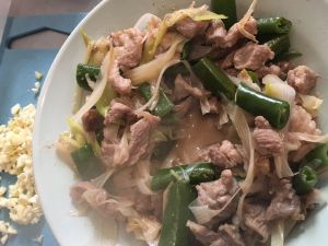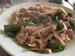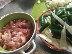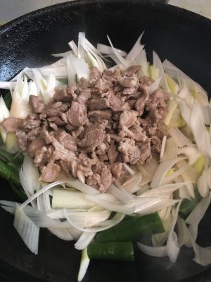 留底油炒大葱辣椒,再把刚才的羊肉放进去。