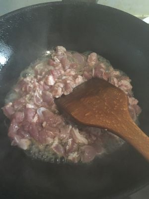 锅里倒入25g油烧至6成热,下腌好的羊肉迅速划开炒至变色捞出