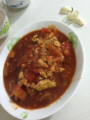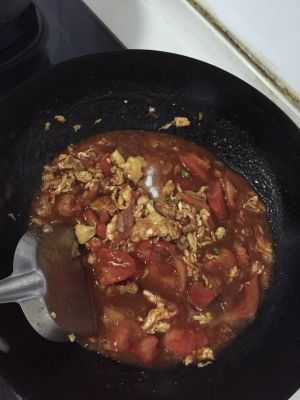 锅里剩的油加入切好的西红柿片中火炒软,可以加少许糖。西红柿炒烂后加入开水,转大火煮。