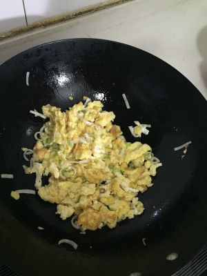 将油热好,放入切好的葱碎加热至微黄,倒入搅好的鸡蛋。炒熟可以嫩一点。先出锅备用。