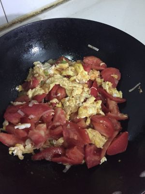 炒成糊状的西红柿,加盐、味精,然后倒入炒熟的鸡蛋,搅拌均匀。