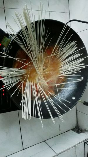 然后加入两碗清水烧开,水开后加入盐,酱油,醋,辣椒酱等作料