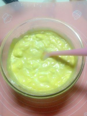 将放凉的蛋奶液和芒果泥倒入打好的奶油里拌匀