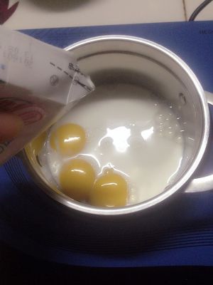将蛋黄倒入奶锅里再将牛奶倒入