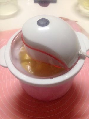 从冰箱里拿出冷冻了一夜的冰淇淋机,插进搅拌棒,启动开关,缓缓的将冰淇淋液体倒入冰淇淋机里,搅拌半个小时