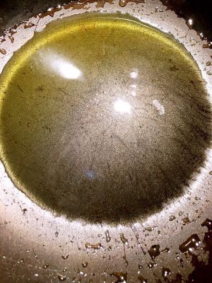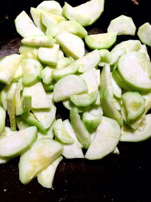 锅中加菜籽油,先把蒜粒呛锅,出香味时放丝瓜。一直不停地炒,炒至丝瓜变软。