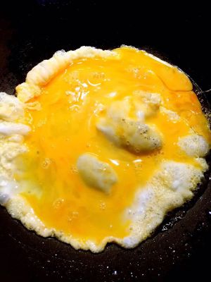 倒入打好的鸡蛋翻炒至七成熟盛出备用。