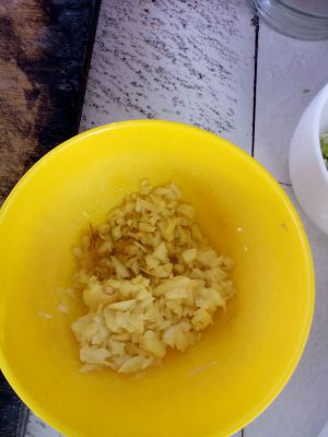 锅内倒油,放入姜末,爆香,倒入鸡蛋液,中火将鸡蛋煎熟后盛出待用。