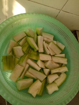 丝瓜去皮,切滚刀块,放碗里加盐腌一下,至少10分钟。(丝瓜去皮时,我是去的干干净净的,否则,炒出来的丝瓜感觉有些僵硬)。腌过的丝瓜用水冲一下,沥干水。