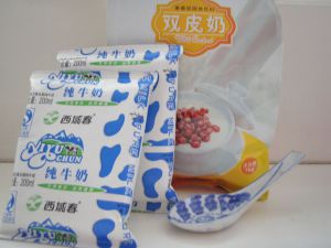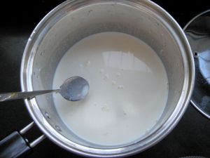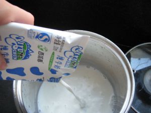首先把两袋牛奶倒入锅里(最好是新鲜牛奶,要不稍微纯一点的牛奶也行,有些牛奶做出来会有水,看你的选择了)