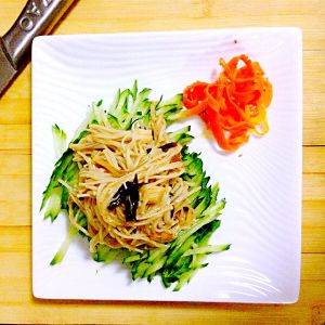 煮后捞出过冷水,为了让金针菇有嚼劲爽口这个步骤不能省哦。