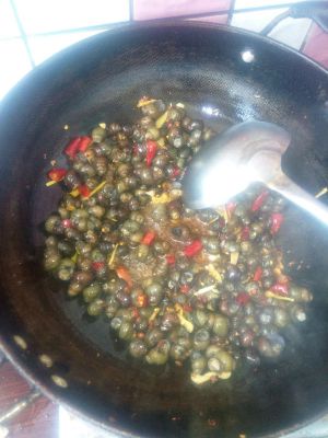 锅里放油烧热,下入葱姜蒜花椒干辣椒炒香。到入田螺肉,翻炒均匀在放入盐,生抽,少许料酒。爆炒几分钟,再倒入切好的辣椒圈。加一碗开水煮几分钟,水煮干就差不多了在放点鸡精起锅