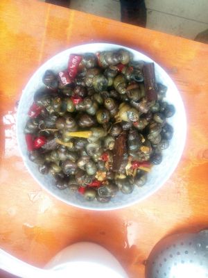 汤汁收干不用特别干,田螺浸泡着更有味道,加适量味精就可以出锅啦。怕不够辣我还放了几勺辣椒粉