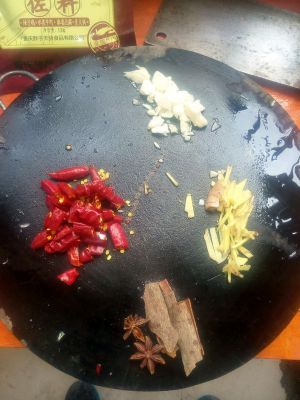 加入姜,蒜,干辣椒,桂皮,八角,炒香