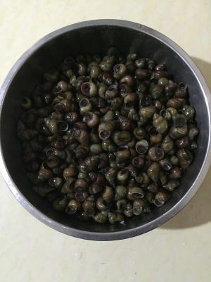 买的田螺,养一天,多次搓洗,换水。剪去尾端,沸水下锅,加儿片姜,去腥,煮三分钟,出锅,再用冷水冼几遍待用