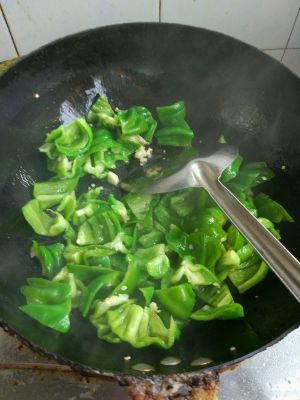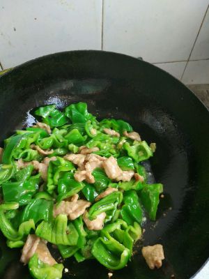 油热了放肉翻炒,变色后放点酱油翻炒、然后放入青椒翻炒。