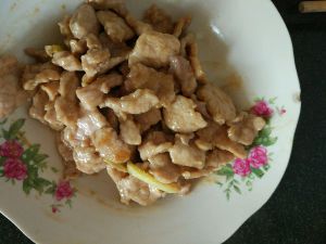 继续翻炒30秒(切忌不可太过频繁的翻炒)加入瘦肉丝,倒入勾芡汁既可。