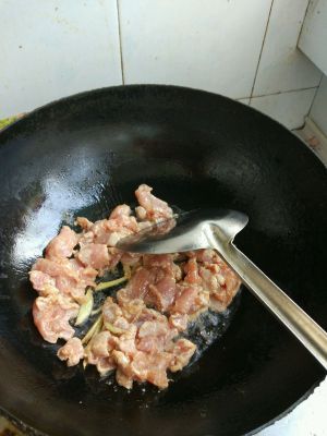 锅里放油先烧热 打入肉片 翻炒几分钟 变色后装盘