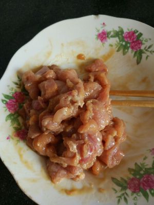 肉切好后 放入少量盐 生抽 耗油 生粉 加少量水 拌匀 腌制一会 这样更入味