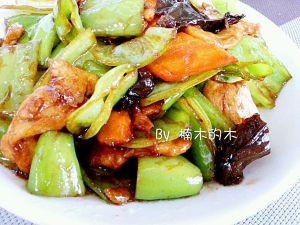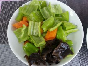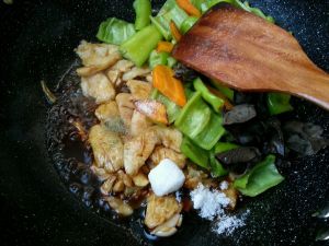 再放酱油2勺,耗油一勺,入青椒,木耳,胡萝卜,盐少许,糖一勺