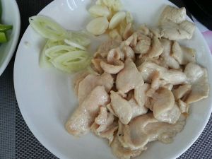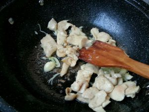 鸡肉切片,加淀粉,料酒,拌均匀上浆,炒熟,葱蒜备用
