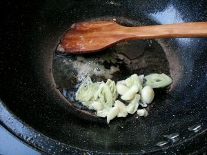 热油加入青椒翻炒15分钟左右,期间往锅边加点水炒,使椒不易炒焦且有水分