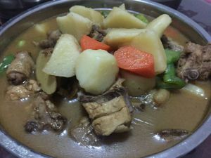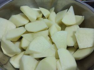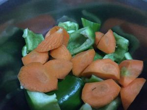 翻炒均匀,加开水,开锅后下土豆。大火烧开,中火炖十到十五分钟,放胡萝卜,在煮五分钟,放青椒,尝一尝味道,适当加点盐,如果合适也可以不放,加点糖,味精,就可以出锅了