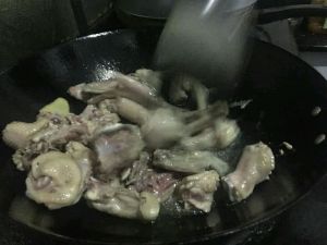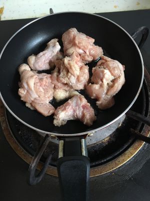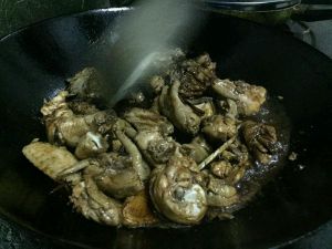 放鸡腿肉,翻炒一会。倒点料酒和生抽6勺