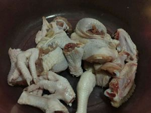 将鸡洗净去掉头和屁股,切成大小合适的块。