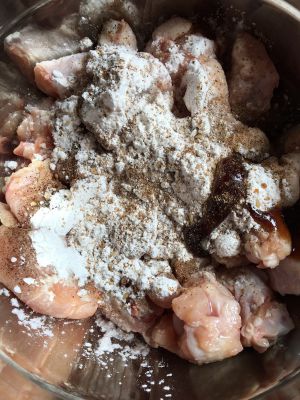 鸡腿切小,用淀粉,胡椒粉,椒盐,蚝油。拌均匀(本来我是准备焯下水的,但是这样不好腌制)