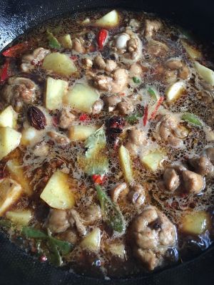 7、加入开水,没过鸡肉和土豆,中火慢慢炖收汤汁。