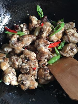 油烧热,把倒入2勺白糖,用锅铲把糖搅化开,然后倒入鸡块翻炒,炒至鸡块里的水分完全没有之后,倒入适量的酱油上色,放2-3勺盐再继续翻炒,再倒入佐料及大蒜翻炒出香味。