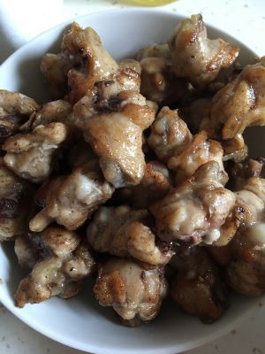 腌制好的鸡腿肉,放点油在小煎锅里煎酥一点。(我个人喜欢酥的,不喜欢太咬的就少炸一会)