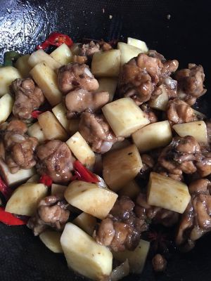 6、鸡肉炒熟上色,加入土豆、胡萝卜炒熟。