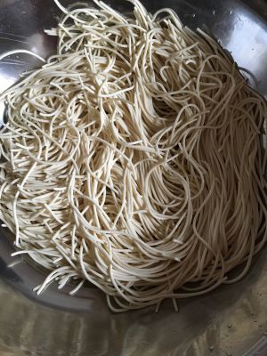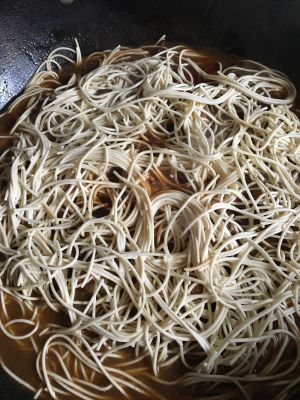 8、汤汁收的差不多时,倒入青红辣椒炒熟,另一个锅烧开水下面,把面煮熟捞出拌在汤汁里即