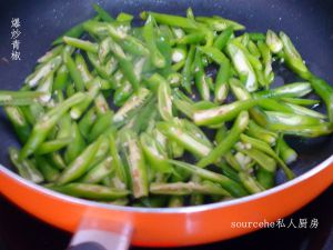 放人青椒丝,再放人淹制过的肉丝,翻炒几下。