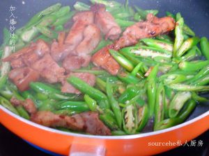 猪肉熟后,将青椒倒入一起翻炒,加盐和味精