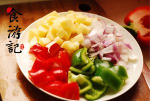 鸡脯肉切丁、土豆、胡萝卜、洋葱分别去皮切丁,咖喱粉中加入少许清水调成膏状 锅热油后加入鸡脯肉丁划炒至变色后调入料酒和糖,继续翻炒一会,加入土豆、胡萝卜和一半分量的洋葱翻炒