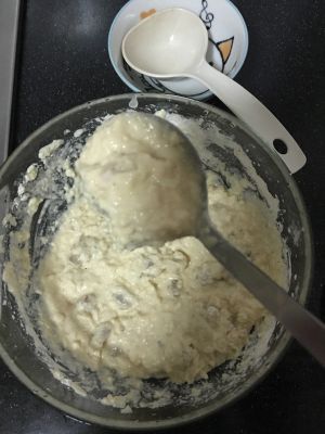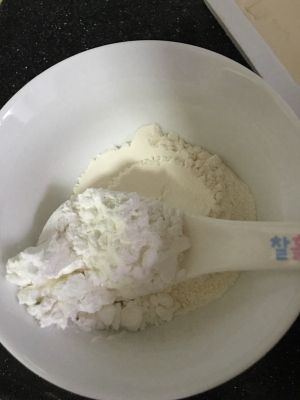 一勺面粉和淀粉拌匀后加到虾肉里面搅拌,当然要根据湿度来加,太湿再加粉。